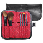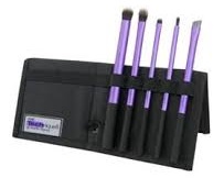 Travel like a pro with this handy set. The buckle closure snaps securely to hold brushes in place. Set includes a blush brush, powder/complexion brush, eyeshadow blending brush, eyeshadow detail brush, concealer brush, and a retractable lip brush.